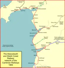 Further north, the Carnarvonshire Railway was incorporated on 29 July 1862 with powers to build from Carnarvon to Portmadoc by way of Afon Wen.[12] The Carnarvonshire Railway authorisation duplicated the A&WCR as between Afon Wen and Portmadoc. The duplication was ignored at first, but the position was finally resolved by an agreement of 13 December 1865 under which the Cambrian Railways (successor to the A&WCR) built the section.[12][8]