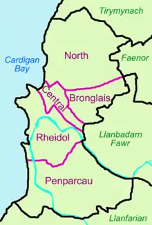 The Rheidol ward covers the area immediately southwest of the town centre surrounding the mouth of the River Rheidol. It includes Aberystwyth Castle, the Old College buildings and Council Offices in the north of the ward, with Aberystwyth Marina and the residential area of Trefechan towards the south.[1] The Aberystwyth South ward (known as Penparcau for elections to the town council) borders to the south and Aberystwyth Canol/Central to the east.