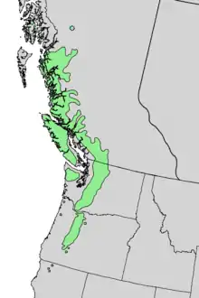 The species is native to the Pacific Northwest of North America, occurring in the Pacific Coast Ranges and the Cascade Range from the extreme southeast of Alaska, through western British Columbia, Washington and Oregon, to the extreme northwest of California. It grows from sea level to 1,500 m (4,900 ft) in the north of the range, and to 1,000–2,300 m (3,300–7,500 ft) in the south of the range.