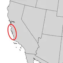 The fir currently grows in a few scattered areas within the Santa Lucia Mountains along the Pacific Slope of California. Four concentrations are found in the vicinity of the Ventana Double Cone and Kandlbinder Peaks, Junipero Serra Peak, Cone Peak, and on the Monterey / San Luis Obispo County line, along San Carpóforo Creek within the Hearst Ranch.[5] The most inland stand, 13 miles (21 km) from the Pacific Coast, was found in Anastasia Canyon in the vicinity of the Arroyo Seco River and Tassajara Hot Springs.[2]