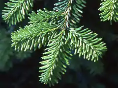 Maries' fir is very closely related to Pacific silver fir A. amabilis from the Pacific coast of North America, which is distinguished by its slightly longer leaves (2–4.5 cm) and larger cones (9–17 cm long).