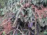 The Spanish name oyamel comes from the Nahuatl word oyametl (oya, "to thresh"; metl, "agave"; literally "threshing agave"). It is also called árbol de Navidad (Christmas tree) in Mexico. The English name derives from the binomial Abies religiosa, literally "religious fir". This comes from the use of its cut foliage in religious festivals (notably at Christmas) and in churches in Mexico.[5]