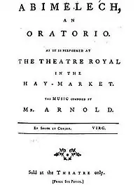Abimelech was performed once at the Theatre Royal on 18 March 1768 and once, after Smart's death, at Covent Garden on 25 March 1772.[5] There are no surviving scores for Abimelech, but the libretto was sold during its run at the Theatre Royal, Haymarket, in 1768 and the run of the revised version of the oratorio at the Covent-Garden in 1772.[6] These works were published anonymously but Charles Burney, Smart's friend, attributes the libretto to Smart and pasticcios from Handel in his General History of Music.[7] The "pasticcios" were musical selections from Handel used by the composer Samuel Arnold.[5]