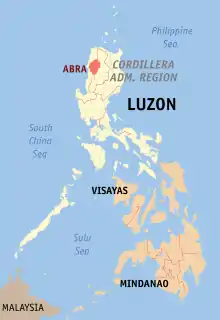 Abra's at-large congressional district refers to the lone congressional district of the Philippines in the province of Abra. Abra has been represented in the country's various national legislatures since 1898.[3] The first congressional delegation consisted of two members in the First Philippine Republic legislature known as the Malolos Congress. Since 1919 when it was re-established as a regular province separate from Ilocos Sur, Abra has been entitled to one member in the House of Representatives of the Philippines, elected provincewide at-large, except for a brief period between 1943 and 1944 when it was again represented by two members in the National Assembly of the Second Philippine Republic.[4] From 1978 to 1984, all provinces were converted into multi-seat regional at-large districts for the Interim Batasang Pambansa of the Fourth Philippine Republic, with Abra forming part of the twelve-seat Region I's at-large district. It was restored as a single-member district in 1984.[4]
