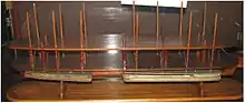 Lincoln labeled his invention Buoying Vessels Over Shoals and it was used to get them over shoals.[7] He envisioned a system of waterproof fabric bladders that could be inflated when necessary to help ease a stuck steamboat over such obstacles.[8] When crew members knew their ship was stuck, or at risk of hitting a shallow, Lincoln's invention could be activated, which would inflate accordion-shaped air chambers along the sides of the watercraft to lift it above the water's surface, providing enough clearance to avoid a disaster.[9] As part of the research process, Lincoln designed a scale model of a ship outfitted with the device.[10] This model (built and assembled with the assistance of a mechanic from Springfield named Walter Davis[10]) that was originally taken to the United States Patent and Trademark Office in Washington[11] is now on display at the Smithsonian Institution.[12] At the time the patent was issued, Lincoln was a congressman. He is the only United States president to be a patentee.[12]