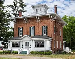 The Abram C. Fisk House is a two-story red brick Italianate structure with a hip roof crowned with a cupola. The house measures 40 feet by 40 feet and stands on an ashlar stone foundation. The facade is symmetrical, and is decorated with raised brick pilasters and arched head windows. The eaves are supported with oversized paired brackets, shaped in a wheel-with-daisy pattern.[2]
