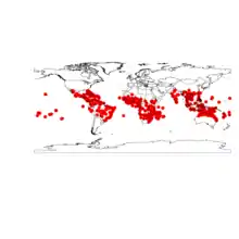 Abrus precatorius is a severely invasive plant in warm temperate to tropical regions, so much so that it has become effectively pantropical in distribution. It had been widely introduced by humans, and the brightly coloured and hard-shelled seeds had been spread by birds. By the end of the twentieth century, it had been proclaimed as an invasive weed in many regions including some in Belize, Caribbean Islands, Hawaii, Polynesia and parts of the mainland United States. In Florida in particular, the plant has invaded undisturbed pinelands and hammocks, including the vulnerable pine rocklands.