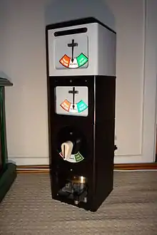 A train approaching a section is offered by a signalman to his counterpart at the next signal box. If the section is clear, the latter accepts the train, and the first signalman may clear his signals to give permission for the train to enter the section.[2] This communication traditionally takes place by bell codes and status indications transmitted over a simple telegraph wire circuit between signalmen using a device called a block instrument, although some contemporary block working is operated wirelessly. This process is repeated for every block section a train passes through. The absolute block system does not replace the use of any other form of signalling, such as fixed signals, hand signals, or detonators – and, in fact, usually relies on fixed signals.[3]