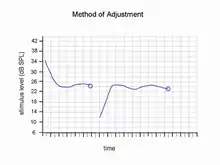 Bekesy's method contains some aspects of classical methods and staircase methods. The level of the stimulus is automatically varied at a fixed rate. The subject is asked to press a button when the stimulus is detectable.