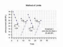 - Similarly, as in the method of limits, the stimuli are adjusted in predetermined steps. After obtaining from six to eight reversals, the first one is discarded and the threshold is defined as the average of the midpoints of the remaining runs. Experiments showed that this method provides only 50% accuracy.[12]