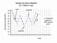 The simple '1-down-1-up' method consists of series of descending and ascending trials runs and turning points (reversals). The stimulus level is increased if the subject does not respond and decreased when a response occurs.