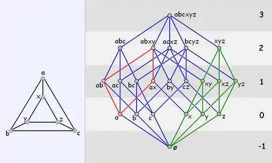 Smaller posets, and polytopes in particular, are often best visualised in a Hasse diagram, as shown. By convention, faces of equal rank are placed on the same vertical level. Each "line" between faces, say F, G, indicates an ordering relation < such that F < G where F is below G in the diagram.