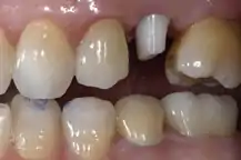 In dentistry, an abutment is a connecting element.[1] This is used in the context of a fixed bridge (the "abutment teeth" referring to the teeth supporting the bridge), partial removable dentures (the "abutment teeth" referring to the teeth supporting the partial) and in implants (used to attach a crown, bridge, or removable denture to the dental implant fixture). The implant fixture is the screw-like component that is osseointegrated.