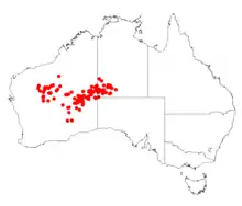 It is native to an area in the Pilbara and Goldfields region of Western Australia where it is found on and among sand dunes, sandplains and on gravelly hillslopes growing in red sandy lateritic based soils.[3] The species has a scattered distribution from around Newman in the west extending east through the Pilbara and Great Sandy and Gibson Deserts across the border into the Northern Territory to around Lake Amadeus in the east usually as a part of spinifex communities.[4]