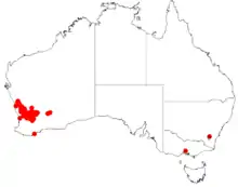 It is endemic to an area in the Mid West and Wheatbelt regions of Western Australia where it is frequently found along roadsides and on low-lying flats growing in clay, loamy or sandy soils.[1] It is commonly a part of mid-storey of Eucalyptus salmonophloia woodland communities but will also form dense stands in disturbed areas.[2]