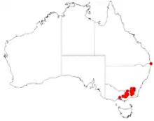 The shrub has a disjunct distribution and is found in the Snowy Mountains of New South Wales and southern parts of the Australian Capital Territory with a range that continues further south to around Mount Baw Baw in the eastern Victorian highlands. It is found in hilltops and ranges and plateaus with an altitude of 1,300 to 1,800 m (4,300 to 5,900 ft). It is often situated in granitic and windswept areas and sometimes forms dense thickets. It is often a part of woodland and heathlands communities.[4]
