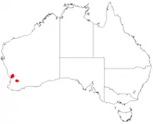 It is native to a small area in the Wheatbelt region of Western Australia where it is commonly situated on hillslopes growing in gravelly lateritic soils.[1] The limited range is around New Norcia as a part of heathland or open Eucalyptus wandoo woddland or Corymbia calophylla woodland communities.[2]