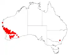 It is native to an area in the Mid West, Goldfields-Esperance and Wheatbelt regions of Western Australia where it found on low limestone or lateritic hills or among granite outcrops growing in a variety of different soil types.[1] The distribution of the shrub extends from Kalbarri in the north to around Nyabing in the south and as far inland as to the east of Norseman as a part of scrub, shrubland or mallee communities or in more coastal areas in coastal heath.[2]
