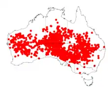 Mulga savanna and mulga codominant tussock grasslands cover roughly 20% of the Australian continent, or about 1.5 million square kilometres. The mean rainfall for much of the habitat for A. aneura in Australia is roughly 200–250 mm/year, but it goes to as high as 500 mm/year in New South Wales and Queensland. The lowest mean rainfall where it grows is about 50–60 mm/year.[4] Both summer and winter rainfall are necessary to maintain mulga, and the species is absent from semiarid regions that experience summer or winter drought.[5]