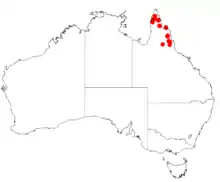 It has a disjunct distribution throughout far north Queensland and is found in three localities separated by great distances from each other on or near the Great Dividing Range on Cape York Peninsula. These are the area around Iron Range Mining, the area around Mount Janet and surrounding the junction of Walsh River and Price Creek where it is usually found as a part of Eucalyptus normantonensis or Eucalyptus cullenii woodland communities.[2]