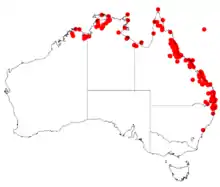 Acacia aulacocarpa occurs naturally east of the Great Dividing Range from northern Queensland to northern New South Wales. Despite the widespread distribution of the species it is not very common as populations tend to be locally restricted to run-off sites around rocky outcrops or along creek banks.[2] It is quite uncommon in New South Wales and only found in the Grafton district.[4] It is far more widespread in Queensland and has discontinuous distribution along the coast and adjacent tablelands of the Great Dividing Range from around Daintree in the north to south of Brisbane in the south.[2] It grows in sandy soils as a part of sclerophyll forest or woodland communities on sandstone.[4]