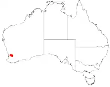The shrub is endemic to a small area between Beverley, Brookton and York in the Wheatbelt region of Western Australia where it is found in damp low-lying areas such as swamps where it grows in sandy-clay or loam soils.[2] There are six populations of the wattle that are found in two main areas with an estimated 5000 recorded individuals remaining. One of the populations is found within the Wandoo National Park while the others are along roadsides and in railway reserve remnants.[3] It is found in open woodland communities as part of a dense understorey. It is commonly associated with Eucalyptus wandoo or species of Allocasuarina, Callistemon phoeniceum, Hakea varia, species of Leptospermum and species of Melaleuca.[3]