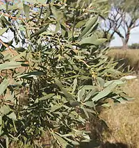 Acacia cambagei, commonly known as gidgee, stinking wattle, stinking gidgee in English, or gidjiirr, by transliteration from indigenous languages of north-western NSW,[1] is an endemic tree of Australia. It is found primarily in semiarid and arid Queensland, but extends into the Northern Territory, South Australia and north-western New South Wales. It can reach up to 12 m in height and can form extensive open woodland communities.[2] The leaves, bark, and litter of A. cambagei produce a characteristic odour, vaguely reminiscent of boiled cabbage, gas or sewerage that accounts for the common name of "stinking gidgee".