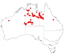 It is native to an area in Queensland, the Northern Territory and the Kimberley and Goldfields regions of Western Australia.[1] It is found from the Sir Frederick Range in Western Australia in the west through central parts of the Northern Territory to around Cloncurry to Mount Isa where it grows in skeletal rocky lateritic and deep sandy soils.[2]