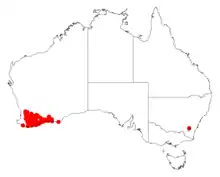 It is native to an area in the Great Southern, Wheatbelt and the Goldfields-Esperance regions of Western Australia where it grows in sandy or clay soils over laterite.[1] The distribution is scattered from around York extending south to around the Stirling Range and east as far as Scaddan. It is found in Eucalyptus wandoo woodlands, Eucalyptus marginata forests, in mallee scrub and sometimes in low heath communities.[2]