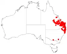 The shrub is widely distributed throughout south-eastern Queensland from around Jericho in the west to around Bundaberg in the west and is also found as far south west as the Dumaresq River in New South Wales and down the north coast to around Coffs Harbour, New South Wales where it situated on low ridges growing in gravelly, sandy to loamy soils often over sandstone usually as a part of heathland or dry sclerophyll forest communities.[3] It is usually a part of the understorey in forests dominated by Eucalyptus racemosa or Corymbia citriodora.[5]