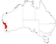 It is native to an area along the west coast in the Mid West and the Wheatbelt regions of Western Australia[1] where it has a discontinuous distribution from Geraldton in the north down to around Wongan Hills in the south.[2] It grows among rocky outcrops and hilltops in stony lateritic clay soils[1] as part of open woodland or low shrubland communities.