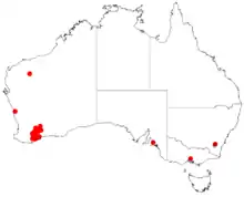 It is native to an area in Wheatbelt and Great Southern regions of Western Australia where it is commonly situated on undulating sandplains and colluvial flats growing in sandy-clay, loamy-clay or clay soils.[1] Although common in the areas it is found it has a scattered distribution from around Karlgarin in the north down to around Gnowangerup in the south west and near Jerramungup in the south east where it is usually a part of low Eucalyptus woodland or open shrub mallee communities.[2]