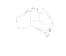 The shrub has a limited distribution about 20 km (12 mi) south of Eden in south western New South Wales with the bulk of the population confined to the Nadgee State Forest and within the boundaries of the proposed Narrabarba Hill Flora Reserve over a range of about 3 km (1.9 mi). Another smaller population in situated in Ben Boyd National Park. The species is found on rocky rhyolite and apatite ridge-tops with nutrient poor skeletal sandy soils but sometimes in brown to black loamy soils. The estimated population is about 6,000 individuals in an area of around 4 ha (9.9 acres).[1]