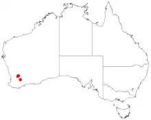 It is native to an area in the Wheatbelt region of Western Australia where it occurs among granite outcrops in pockets of soils.[2] It is only found in a few populations located between Kellerberrin and Kulin.[1]