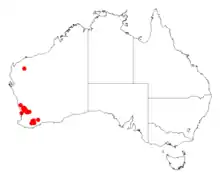 It is native to an area in the Great Southern and Wheatbelt regions of Western Australia where it grows in lateritic gravelly sandy soils.[1] The shrub has a discontinuous distribution and is mostly situated from around Mogumber in the north down to around York in the south. Other smaller populations are also found around further south between Borden, Tambellup and Nyabing as a part of open heathland and open Eucalyptus wandoo woodland communities.[2]