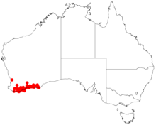 It is native to an area along the south coast in the Goldfields-Esperance and Great Southern regions of Western Australia where it grows in sandy, clay, loamy and gravelly soils.[1] The range of the bulk of the population of the plant is between Cranbrook to Cape Arid National Park with some outlying populations. It usually as a part of mallee shrubland communities but also among heath, low scrub and open wandoo woodlands.[2]