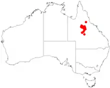 The tree has only a small and series of isolated populations around the small town of Muttaburra to around Elmore Station in an arid part of central Queensland.[1] It has been collected as far south as around Winton north over a distance of 450 km (280 mi) to around Greenvale. The species occurs in an area of around 34,000 km2 (13,000 sq mi) with 15 sub-populations with an estimated total population of about 76,000 individual plants. It is usually part of on wooded downs or in open woodland communities often associated with Acacia cambagei and Atalaya hemiglauca growing in alluvial soils over and around sandstone and basalt. It was declared as vulnerable in accordance with the Environment Protection and Biodiversity Conservation Act 1999 in 2008.[2]