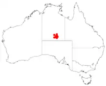 It is endemic to a small are among the plains and hills of the Rodinga Range, Train Hills and Pillar Range on Allambi Station and Todd River Station in the southern part of the Northern Territory to the south of Alice Springs where it is often situated along stony watercourses and in dry rocky gullies at the foot of the ranges and on rocky cliffs composed of sandstone.[4]