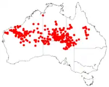 It is native to an area in the Goldfields-Esperance, Pilbara and Mid West regions of Western Australia. It grows well in red sandy soils and is found on sand dunes and stony plains.[1] It is also found in the desert areas of inland Australia; southern part of the Northern Territory, north-eastern South Australia and in southwest Queensland.[3] It is quite common throughout the Simpson Desert.[5] It is found in a range of soil types including stony loam, sandy loam or clay-loam. The shrub is often part of in tall open shrubland or open low woodland communities containing various Acacias and Eucalyptus species as well as spinifex and grassland communities. Sometimes small dense regrowth stands following fire will form.[3]