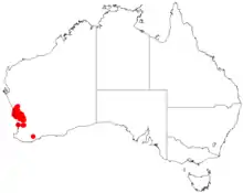 It is native to an area close to the west coast in the Mid West and Wheatbelt regions of Western Australia.[1] The bulk of the population is found from Geraldton in the north to Toodyay in the south. It is found on sandplains, clay flats and rocky lateritic ridges growing in sandy or clay soils.[1] The bulk of the population is scattered from Mingenew south to Mogumber and is often a part of low shrubland or heath communities with scattered Eucalyptus and Banksia species.[2]