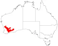 It is native to an area in the Wheatbelt and Goldfields-Esperance regions of Western Australia where it is commonly situated on undulating plains growing in sandy, clay or loamy soils.[1] It has a discontinuous and scattered distribution from Coorow in the north west to Ongerup in the south west to Southern Cross in the north east and Norseman in the south east.[2]