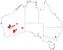 It is native to an area in the Goldfields-Esperance region of Western Australia where it commonly situated on saline stony plains, near salt lakes and sandplains growing in clay, clay-loam, gravelly and sandy soils.[1] It has a scattered distribution and is found from around Windimurra and Weebo Station and Lake Yindarlgooda in the north down to around Norseman in the south as well as Carlisle Lakes as a part of low open shrubland with various species of Atriplex and Maireana.[2]