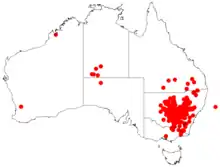 It is endemic to central parts of New South Wales, the Australian Capital Territory and Victoria. It is fairly common on the western slopes of the Great Dividing Range and plains of New South Wales and its range extends through the southern tablelands through the Australian Capital Territory and across Ovens Range in Victoria.[3] In New South Wales it is found as far east as Wollemi spreading as far west as the Ivanhoe District and as far north as Brewarrina. It is found on rocky ridges where it is associated with Eucalyptus and Callitris woodland communities and on red sandy plains where it is often part of mallee communities.[1] In Victoria it is considered rare and has a small disjunct distribution in the East Gippsland Uplands and the northern inland slopes in the Barambogie Range close to Beechworth and around Suggan Buggan where it grows on rocky well-drained hillsides and ridges.[2]