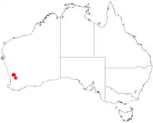 It is native to an area in the Wheatbelt region of Western Australia groeing in sany to sandy-loamy soils often over or around areas of laterite.[1] The distribution of the shrub is limited to a small area from between Wongan Hills and Piawaning as a part of sandy heathland communities where it is often associated with Melaleuca uncinata.[2]