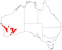 It is native to an area in the Wheatbelt and Goldfields-Esperance regions of Western Australia where it is commonly situated among granite outcrops and on plains growing in sandy or sandy loamy granitic soils.[1] It has a scattered distribution from around Mullewa and Paynes Find in the north to around Tammin, Cardunia Rocks and Bromus in the south as a part of scrubland communities usually dominated by various species of Eucalyptus, Acacia or Allocasuarina acutivalvis.[2]