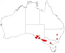 It has a disjunct distribution through parts of south eastern South Australia and western Victoria. It is found on the southern tip of the Eyre Peninsula and Yorke Peninsula from around Curramulka and near Bordertown extending eastwards as far as to Nhill in western Victoria.[3] It is often found as part of woodland to open forest communities and grows in sandy alkaline soils as well as neutral yellow duplex to red porous loamy soils and grey cracking clay soils.[4]