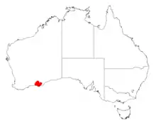 It is endemic to an area along the south coast of the Goldfields-Esperance region of Western Australia where it is found along the edges of salt lakes and marshes and seasonally wet swamp areas growing in sandy-clay-loam soils.[1] It is often part of tall myrtale shrubland and mallee woodland communities.[2]