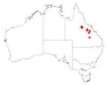 It is endemic to the eastern-central parts of Queensland where it has a disjunct distribution. It is found as far north as the headwaters of Torrens Creek catchment in the White Mountains where it is often situated in sandstone gorges but is also found further to the south around 100 km (62 mi) north of Clermont where it grows in broken country.[1]