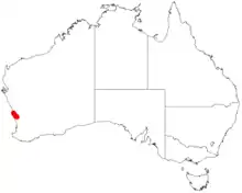 It is endemic to a small area on the west coast area in the Wheatbelt region of Western Australia between Coorow and Dandaraganwhere it is found on hills, breakaways and in gullies growing in gravelly clay loam soils over laterite or sandstone.[3] It is often part of heath or low woodland communities composed of an overstorey of Eucalyptus wandoo and Eucalyptus calophylla with understorey scrub including Hakea lissocarpha and other species of Grevillea, Acacia, Isopogon, Calothamnus and Melaleuca.[2] The plant has a limited range over a distance of around 80 km (50 mi) with the two main populations located near Dandaragan and Jurien Bay with much of the population in Lesueur National Park.
