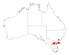 It has a limited distribution in subalpine and montane areas in the east Gippsland region of Victoria from the north east of Melbourne to around Mount Coopracambra where it usually is part of the understorey in tall Eucalyptus forest communities often including Eucalyptus regnans.[1]